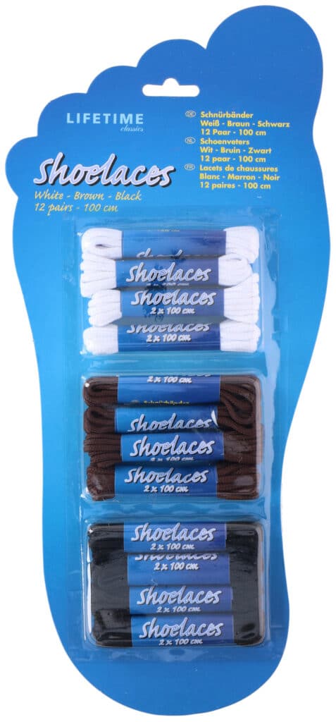 12 paar schoenveters zwart/wit/bruin in voetdisplay
