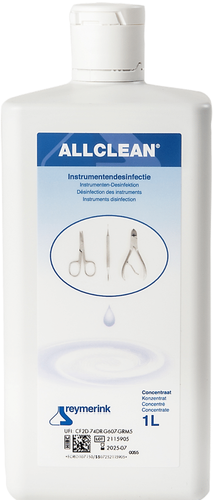 Na de inwerktijd het beste de instrumenten afspoelen met ten minste drinkwater kwaliteit en vervolgens (laten) drogen. Gebruikt reinigingsmiddel elke werkdag vervangen.  CE 0124    Voor fraisen en boren te desinfecteren zie: Allclean RT – Reiniging Desinfectie 1L (Boren)