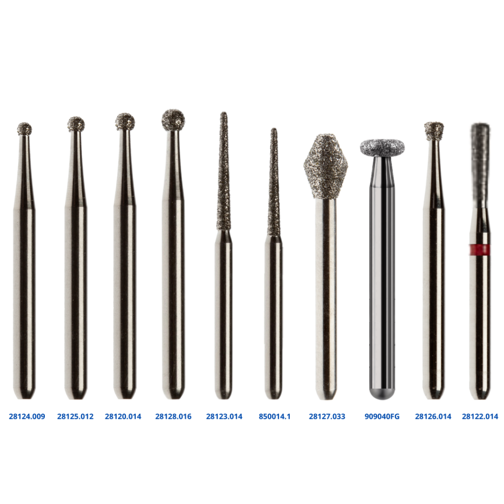 Bolkopfrezen Turbine: 28124.009 – Bolkopfrais 28125.012 – Bolkopfrais 28120.014 – Bolkopfrais 28128.016 – Bolkopfrais CD Fissuurfrezen Turbine: 28123.014 – Fissuur 850014.1 – Fissuur 850023FG – Fissuur middel grof CD51016FG – Fisuur – fraise met perifere koelgroeftechniek Kegelfrezen Turbine: 28127.033 – Kegel CD80023FG – fraise met perifere koelgroeftechniek Paddenstoelfrezen Turbine: 909040FG – Paddenstoel Trapezefrezen Turbine: 28126.014 – Trapeze 28122.014 – Trapeze Maximaal toerental voor Turbine-fraisen is 450.000 toeren p/min. Let op! Deze fraisen zijn alleen voor Turbine handstukken.