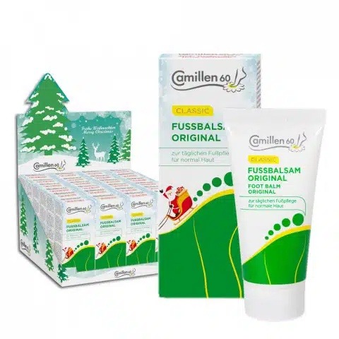 Camillen 60 Voetbalsem Original 30ml Kerst Editie is een verkoelende balsem met kamfer en menthol, geschikt voor de dagelijkse verzorging van de voeten. In een speciale kerst verpakking. Ideaal als kerstgeschenk of voor doorverkoop. Vitaliserend en aangenaam fris voor vermoeide en belaste voeten. Het vermindert eeltvorming en voorkomt gesprongen hielen en een ruwe huid. Uw huid wordt zacht en elastisch. Een doeltreffende verzorging voor doorgelopen voeten. De waardevolle kamillebestanddelen, de etherische olie met zijn hoge bisabololgehalte, het kamille-extract en het azuleen kalmeren de huid en hebben een ontstekingsremmende, antibacteriële en antimycotische werking. Menthol en kamfer stimuleren en verfrissen de huid en verminderen jeuk. Allantoïne bevordert de celregeneratie, heeft een keratolytische werking en maakt ruwe en gesprongen huid weer glad en zacht.