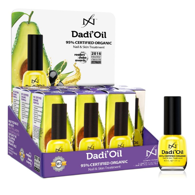 Display met 12 flesjes Dadi’Oil 14,3 ml en alle flesjes zijn van een pipet voorzien. Dadi’ Oil is een verzorgende olie voor de nagel en de huid, die gemaakt is om de huid te voeden en te verzorgen en om flexibiliteit, stevigheid en glans te geven aan de natuurlijke nagel en aan nagelproducten! Dadi’ Oil wordt snel opgenomen en is niet vet. Het brengt drie gecertificeerde organische olieën samen. Een gecertificeerde organische olie is een hoogwaardig product, afkomstig van boeren die duurzame techniek hanteren en geen kunstmatige mest of bestrijdingsmiddelen gebruiken. Avocado, Olijf en Jojoba olie werken samen om te beschermen, te hydrateren en te verzachten. Dadi’ Oil bevat bovendien Natuurlijke Vitamine E (dus geen synthetisch tocopheryl acetaat) een krachtige anti-oxident. Ten slotte zorgt een aromatisch mengsel van 21 essentiële oliën voor een aangename geur en een heilzame, verjongende werking.
