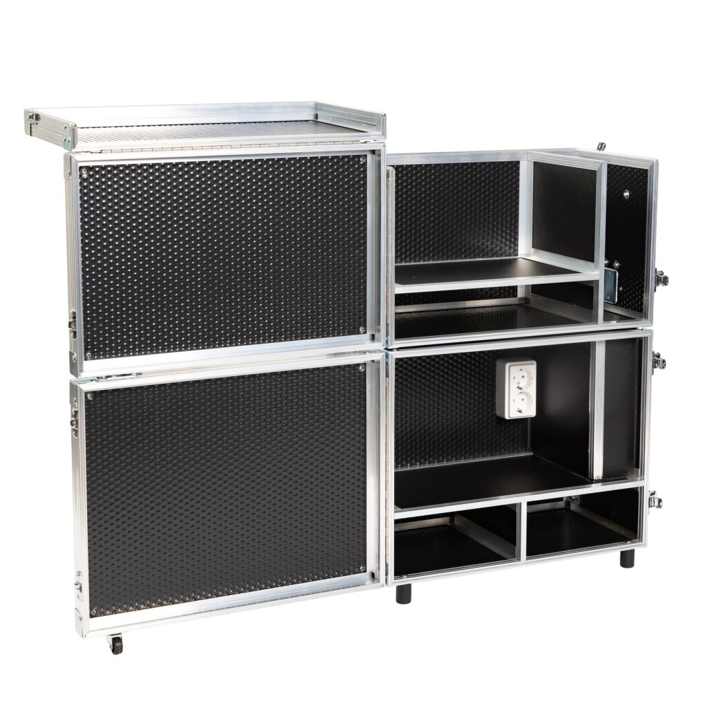 Deelbare koffer Veron zonder lade Deze koffer bestaat uit twee losse delen, waardoor je beide koffers eenvoudig en gescheiden in de auto kunt plaatsen. Door deze verdeling wordt het gewicht beter gespreid, waardoor de koffer gemakkelijker te tillen is en je hem makkelijker meeneemt in de auto. De pedicuremotor wordt geplaatst in het onderste deel van de koffer. Waar de andere deelbare koffer een lade heeft, zit op deze plek een open ruimte. Daarnaast beschikt de koffer over een tweevoudig stopcontact en een oprolbaar snoer van ruim 4 meter, zodat je altijd voldoende werkruimte hebt. De uitschuifbare trolleygreep fungeert tevens als bevestigingspunt voor de beensteun. Dankzij de grote zijwielen is de koffer moeiteloos te verrijden. Hij is vervaardigd uit stevig kunststof en afgewerkt met zware, robuuste sloten voor maximale veiligheid tijdens transport en gebruik.   Buitenmaat complete koffer: Breedte: 49,5 cm (zonder wielen) Breedte: 57 cm (incl. wielen) Diepte: 32 cm (incl. wielen) Hoogte: 74 cm   Buitenmaat bovenste koffer: Breedte: 49,5 cm (zonder handgrepen) Diepte: 29 cm Hoogte: 32,5 cm   Buitenmaat onderste koffer: Breedte: 49,5 cm (zonder wielen) Diepte: 29 cm (31 cm met wielen) Hoogte: 41 cm   Binnenmaat bovenste koffer: Rechter vak (smal/hoog): breed 9 cm – 27 cm hoog – 24 cm diep Groot vak: breed 37,5 cm – hoog 18,5 cm (+ 3 cm deur) – diep 24 cm Onderste vak: breed 37,5 cm – hoog 7,5 cm – diep 24 cm   Binnenmaat onderste koffer Onderste 2 vakken (zelfde) 23 cm breed – 10 cm hoog – 24,5 cm diep Bovenste vak: breed 39 cm – hoog 25 cm – 24 cm diep Aan de zijkant bevindt zich de haspel   Gewicht Totaal: 15,6 kg Bovenste: 7,3 kg   Onderste: 8,3 kg