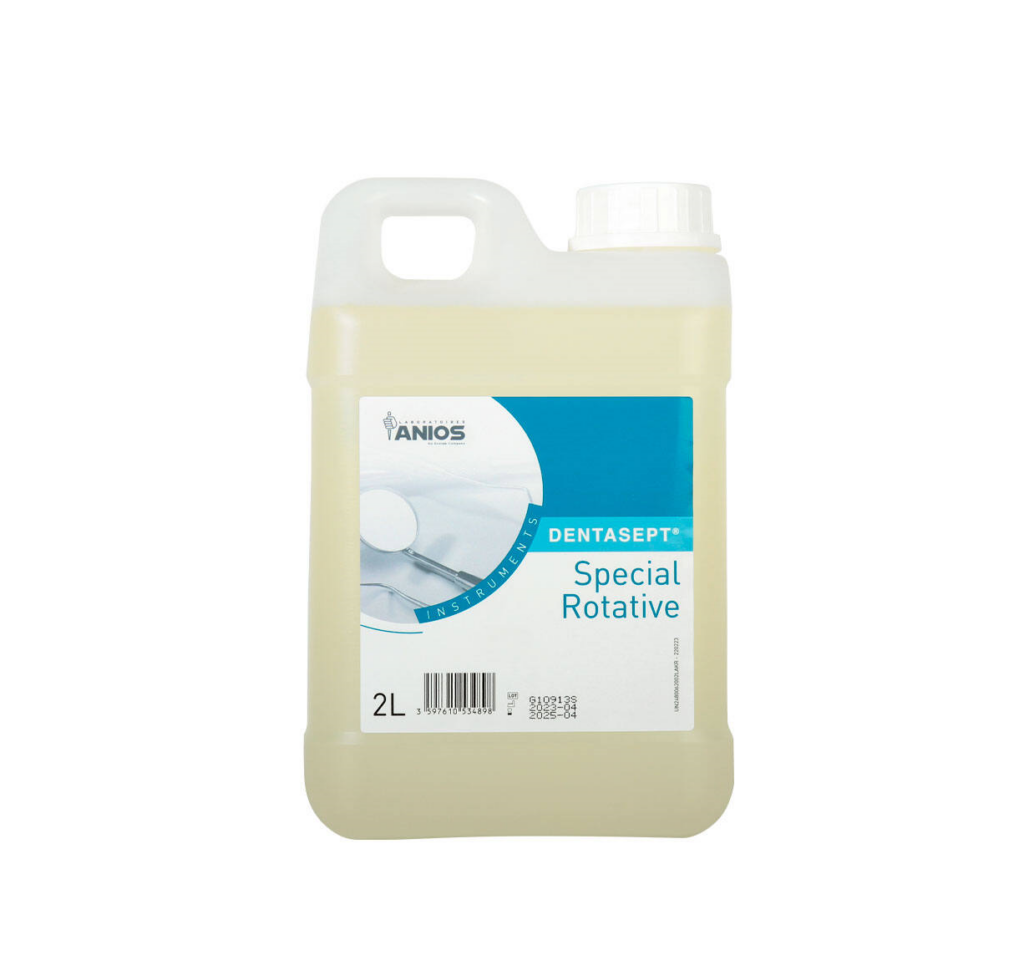 Dentasept (Special Rotative) is een vloeibaar reiniger en desinfectans voor boren, roterende instrumenten en kanaalinstrumenten, voorafgaand aan sterilisatie. Zeer hoge reinigingskracht en korte inwerktijd. Geschikt voor gebruik in
