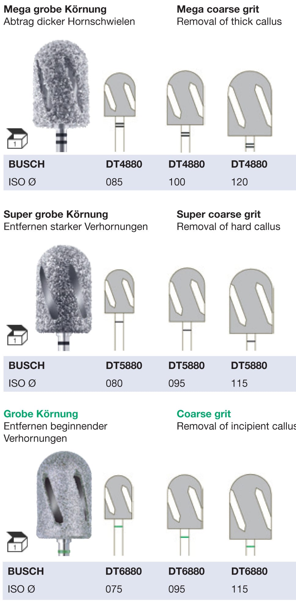 De Dia Twisters van Busch worden al jarenlang succesvol gebruikt voor eeltbehandeling. Bij de Dia Twister is het van groot belang dat u deze op een laag toerental gebruikt, dan werken ze het meest efficiënt. Het gebruik van een Diatwister op een hoog toerental is daarnaast ook slecht voor uw machine. Diamantfraisen van Busch zijn opgebouwd uit meerdere lagen diamantsplinters, hierdoor zijn de frezen erg hard en slijten minder snel. Diamantfraisen gaan erg lang mee. De steel van de frais is van edelstaal – geen roestvorming mogelijk. Busch fraisen zijn bestand tegen reinigings- en desinfectiemiddelen en zijn indien gewenst steriliseerbaar.