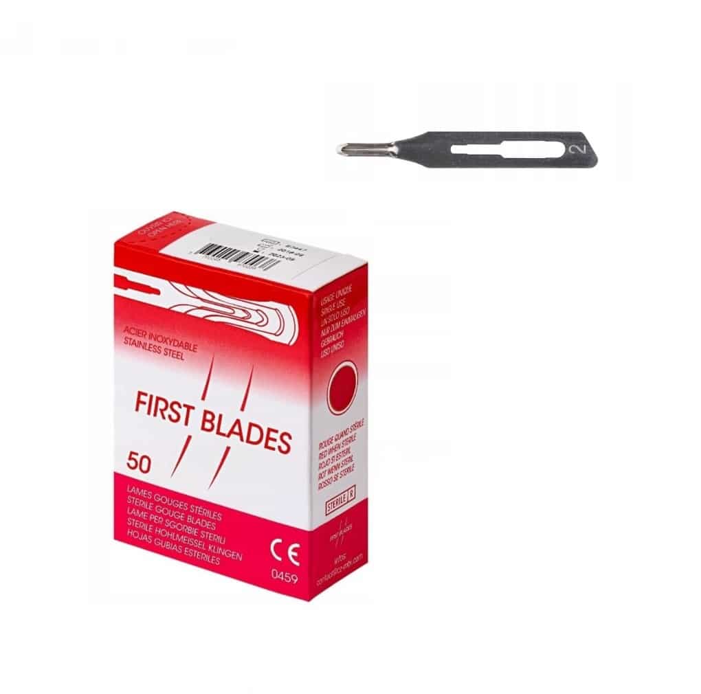 Doos van 50 steriele roestvrijstalen mesjes First Blades, individueel verpakt in aluminiumfolie.