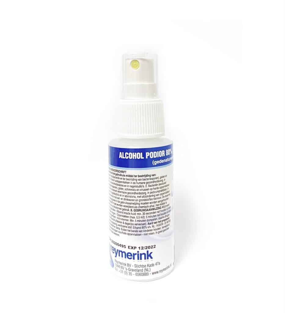 Het middel is een gebruiksklare vloeistof die onverdund moet worden gebruikt Desinfectie van de huid Het middel is alleen bestemd voor desinfectie van de blijvend intacte huid, d.w.z. huid die na desinfectie niet geopend of doorboord zal worden. De te desinfecteren huid eerst reinigen en goed afdrogen. Het middel op de te behandelen huid aanbrengen met bijvoorbeeld een celstofdepper. Zoveel van het middel aanbrengen, dat de behandelde huid gedurende de gehele inwerktijd (minimaal 30 seconden) vochtig blijft. Vervolgens de huid laten drogen. Minimale inwerktijd: 30 seconden. Desinfectie van harde oppervlakken Het middel alleen toepassen op kleine oppervlakken (maximaal 0,5 m2). Te behandelen oppervlakken eerst reinigen. Een daarbij gebruikt reinigingsmiddel afspoelen met schoon water. Overtollig water verwijderen. Breng het middel met een doekje of prop watten aan op het te behandelen oppervlak en laat +/- 5 minuten inwerken. Bij het desinfecteren zoveel vloeistof gebruiken dat het oppervlak gedurende de gehele inwerktijd tijd nat blijft. Hierna met bijvoorbeeld een celstofdoek het oppervlak droogwrijven. inwerktijd: +/- 5 minuten Desinfectie van instrumenten door middel van dompelen De materialen eerst reinigen. Een daarbij gebruikt reinigingsmiddel afspoelen met schoon water. Overtollig water verwijderen. Dompel de materialen vervolgens gedurende +/- 5 minuten in z’n geheel in Alcohol podior 80%. Neem hierna met schone handschoenen de materialen uit het desinfectiemiddel en laat ze op een schone plaats drogen. Tweede plaatje geeft weer in wat voor soort flacon de 50 ml geleverd wordt. Eerste plaatje is een foto van de 500 ml.
