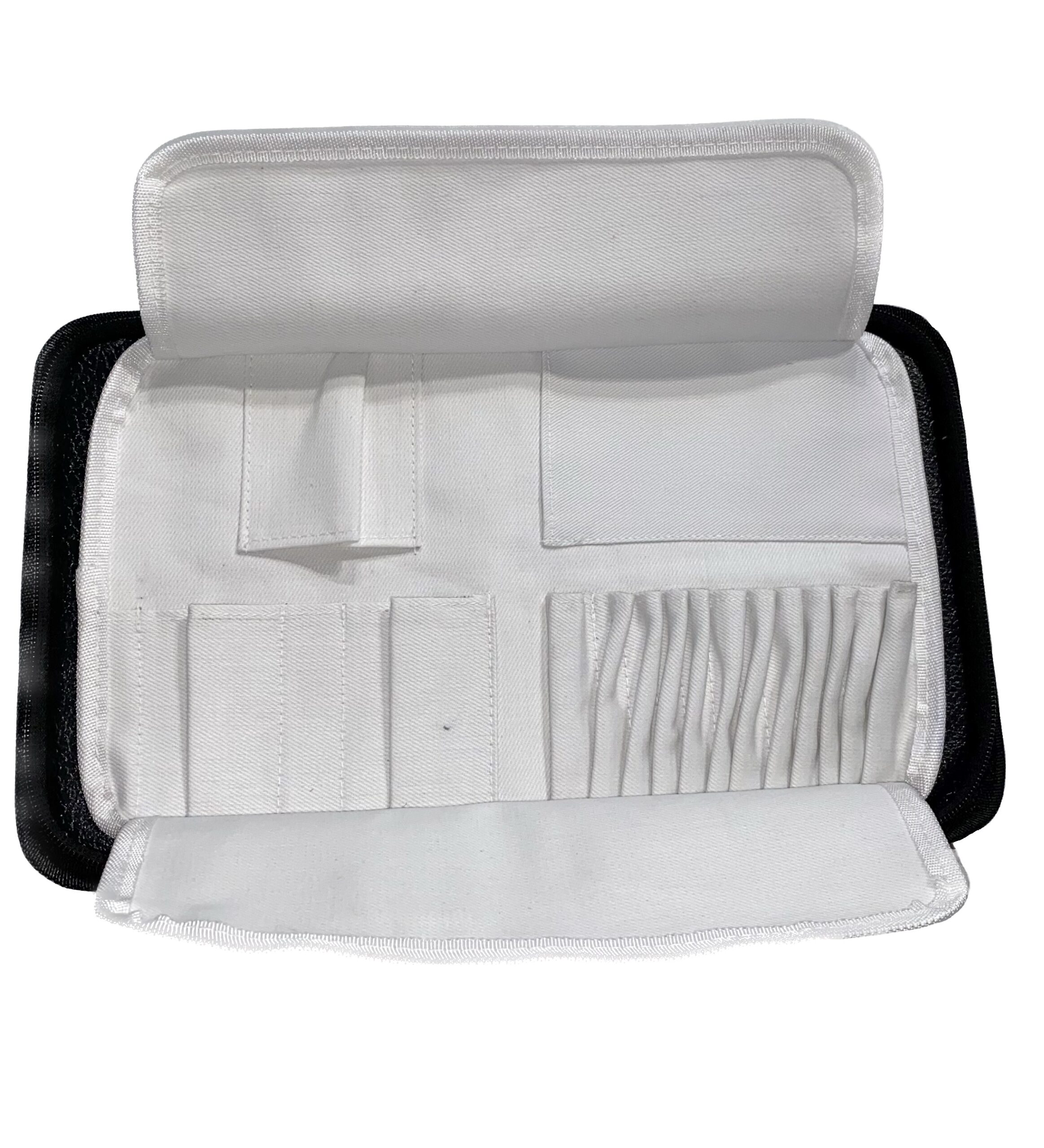 Etui met katoenen inzet geschikt voor het opbergen van instrumenten, tangen, scharen en pincetten. Met name handig voor de ambulante pedicures en schoonheidsspecialisten. De inzet is gemakkelijk uit te nemen om te reinigen. – Materiaal buitenkant: kunstleder – Materiaal binnenkant: katoen – Kleur: zwart – Sluiting: rits