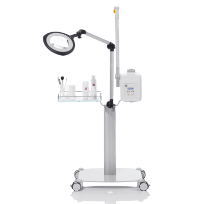 Flexibele toren voor uw instap in professionele instituutbehandeling, met steamer en ruimte voor apparaten en cabineproducten.