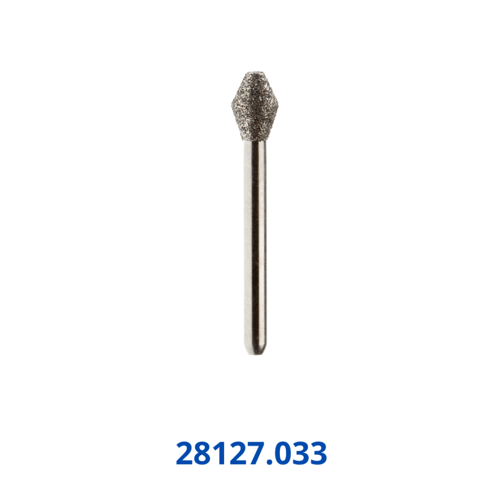 Kegel-frais Turbine 033, De onderstaande fraisen zijn alleen geschikt voor gebruik in turbine/hoek handstukken. Vanwege de kleinere diameter passen de fraisen niet in de normale handstukken – ze zijn alleen voor turbine handstukken. De fraisen hebben een middel grove diamant structuur. Kegelvorm frais voor turbine hoekhandstuk. 3.3 mm Max 450 000 u/min