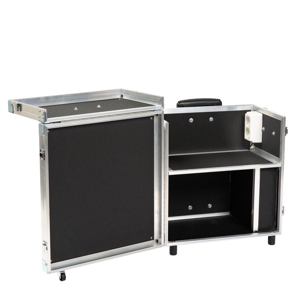 De koffer is uitgerust met een tweevoudig stopcontact en een oprolbaar snoer van ruim 4 meter, zodat je altijd voldoende werkruimte hebt. De uitschuifbare trolleygreep dient tevens als bevestigingspunt voor de beensteun. Dankzij de grote zijwielen is de koffer moeiteloos te verrijden.
