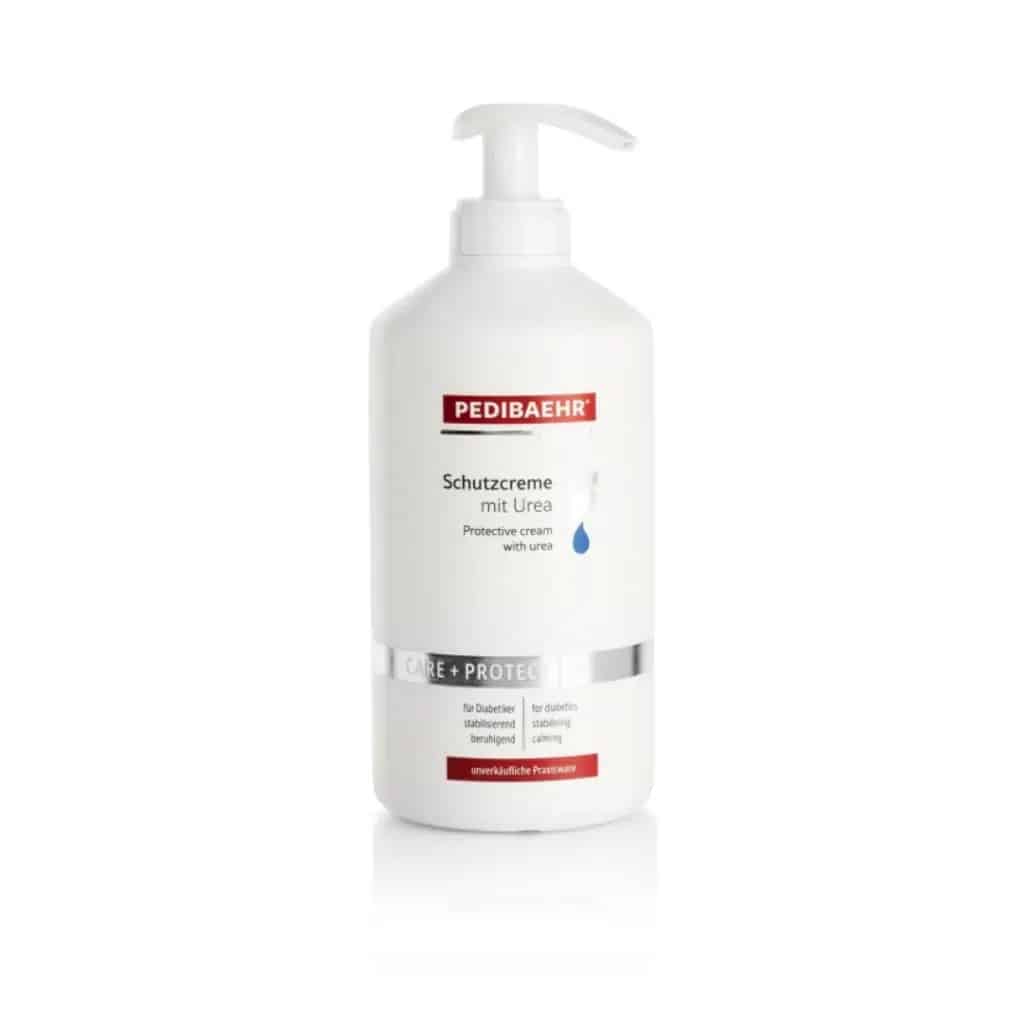 PEDIBAEHR Beschermende creme met ureum 500ml; Voor de verzorging van de droge, gevoelige huid die vatbaar is voor drukpunten. Deze dermatologisch geteste verzorging met 10% ureum hydrateert, verzacht en beschermt de droge, gevoelige huid met drukpunten, terwijl bisabolol en panthenol roodheid verminderen – ook geschikt voor diabetici.