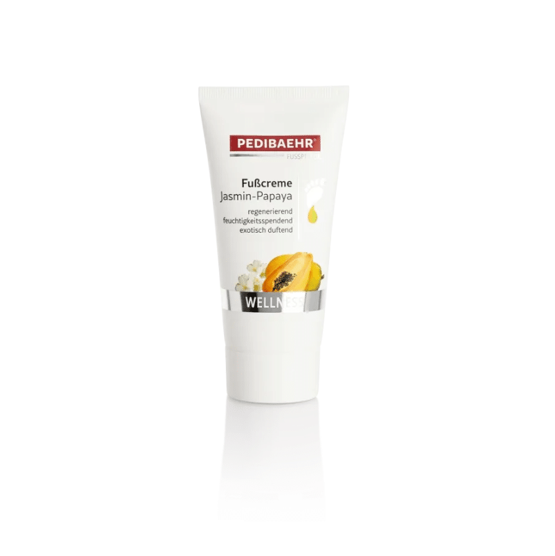 Pedibaehr Voetcreme jasmijn-papaya 30ml; Herstelt en hydrateert droge voeten met sheaboter, ureum en vitamine E, terwijl farnesol de huidflora in balans houdt en een exotische geur van jasmijn en papaja verfrist. Veganistisch.