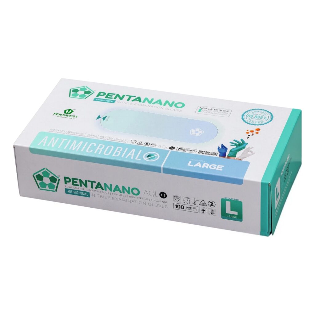De Pentanano Antimicrobial Nitrile Gloves zijn innovatieve, professionele nitrilhandschoenen die méér doen dan alleen beschermen. Waar standaard nitril enkel een barrière vormt, hebben Pentanano handschoenen een geïntegreerde nano-antimicrobiële structuur die bij contact helpt om bacteriën en virussen te reduceren.
