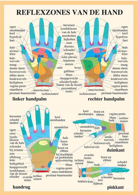 Nederlandstalige handreflexzones / handreflexologie poster A4 met daarop een complete weergave van de meest gangbare opvattingen over de plaats van de reflexzones op de hand. Deze poster is ook zeer goed te gebruiken als hulpmiddel bij uitleg aan patiënten / cliënten tijdens een handmassage