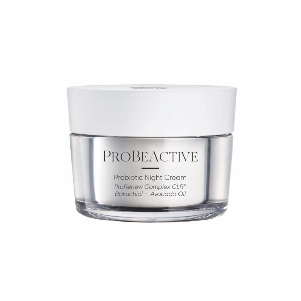 Probiotische nachtcrème met de actieve microbioom-ingrediëntenformule, om de immuuncompetentie te versterken, de huidvernieuwing te activeren en de huidbarrière te regenereren. Met ProRenew Complex CLR™, Lifting Peptide en Bakuchiol.