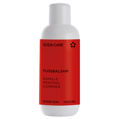 Suda Care Everyday Voetbalsem 1000ml; Deze voetbalsem is uitermate geschikt voor de dagelijkse verzorging van de voeten. De actieve ingrediënten van kamille hebben een ontstekingsremmende werking, terwijl menthol en kamfer een verfrissende werking hebben. Zeer geschikt voor vermoeide en gestreste voeten; heeft een langdurig verkwikkend effect. Indien nodig meerdere malen per dag in de huid masseren.
