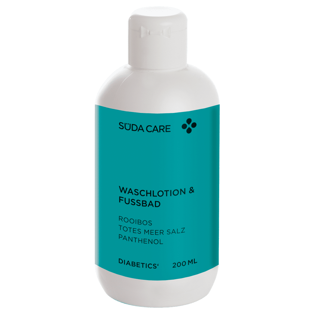 Suda Care linie D waslotion + voetbad 200 ml Diabetisch; Zeer milde reinigingsbasis met zinksurfactant, panthenol, Dode Zeezout, calendula en rooibos.