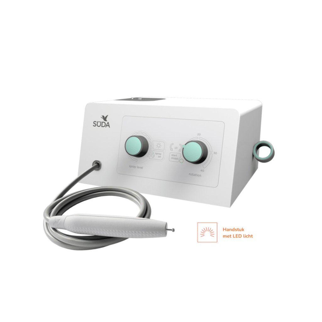 De SUDA S Eco CX + L; Compact design. Twee draaiknoppen voor sprayregeling en toerental instelling. Lichtgewicht ergonomisch handstuk net zelfspansystem. (max 40.000 t.p.m.) Deze machine is gelijk aan de SUDA S Eco CX maar heeft als extra nog LED licht in het handstuk. Voordelen: