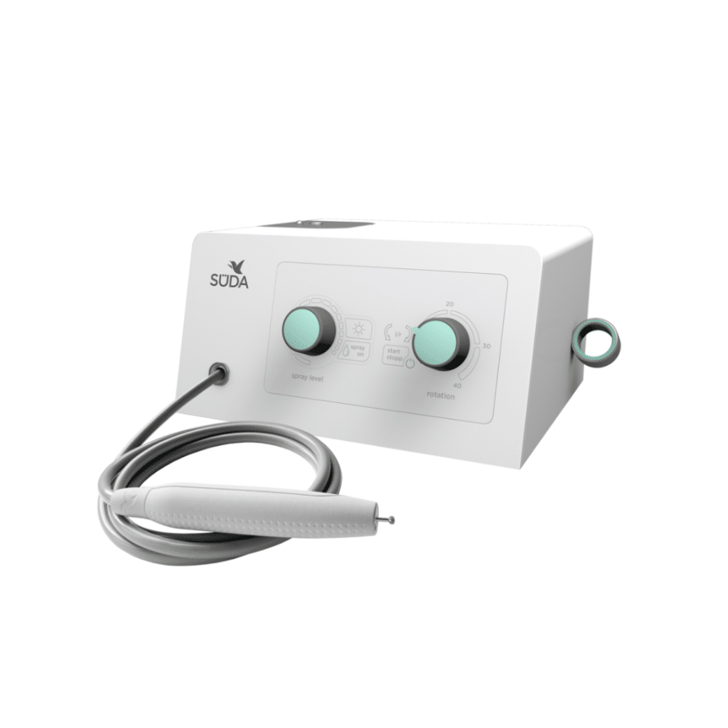 De SUDA S Eco CX; Compact Design, twee draaiknoppen voor sprayregeling en toerental instelling, lichtgewicht ergonomisch handstuk met zelfspansystem. (max 40.000 t.p.m.)