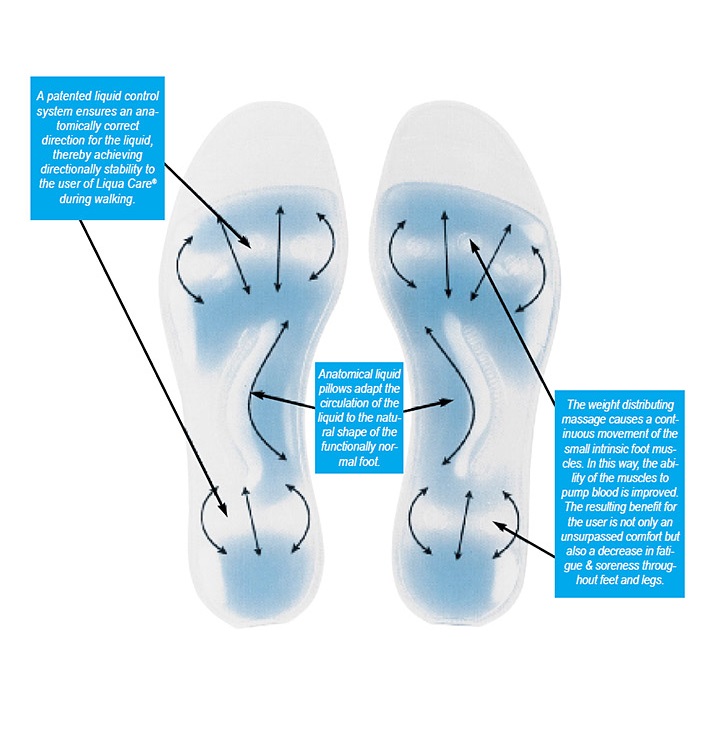 Liqua Care bevat een niet-giftige, nauwkeurig afgemeten vloeistof die door een gepatenteerd vloeistofcontrolesysteem stroomt (zie onderstaand schema). Anatomisch ontworpen kanalen regelen de richting van de vloeistof voor richtingsstabiliteit tijdens het lopen of staan en om de vloeistofstroom af te stemmen op de structuur van de voet.