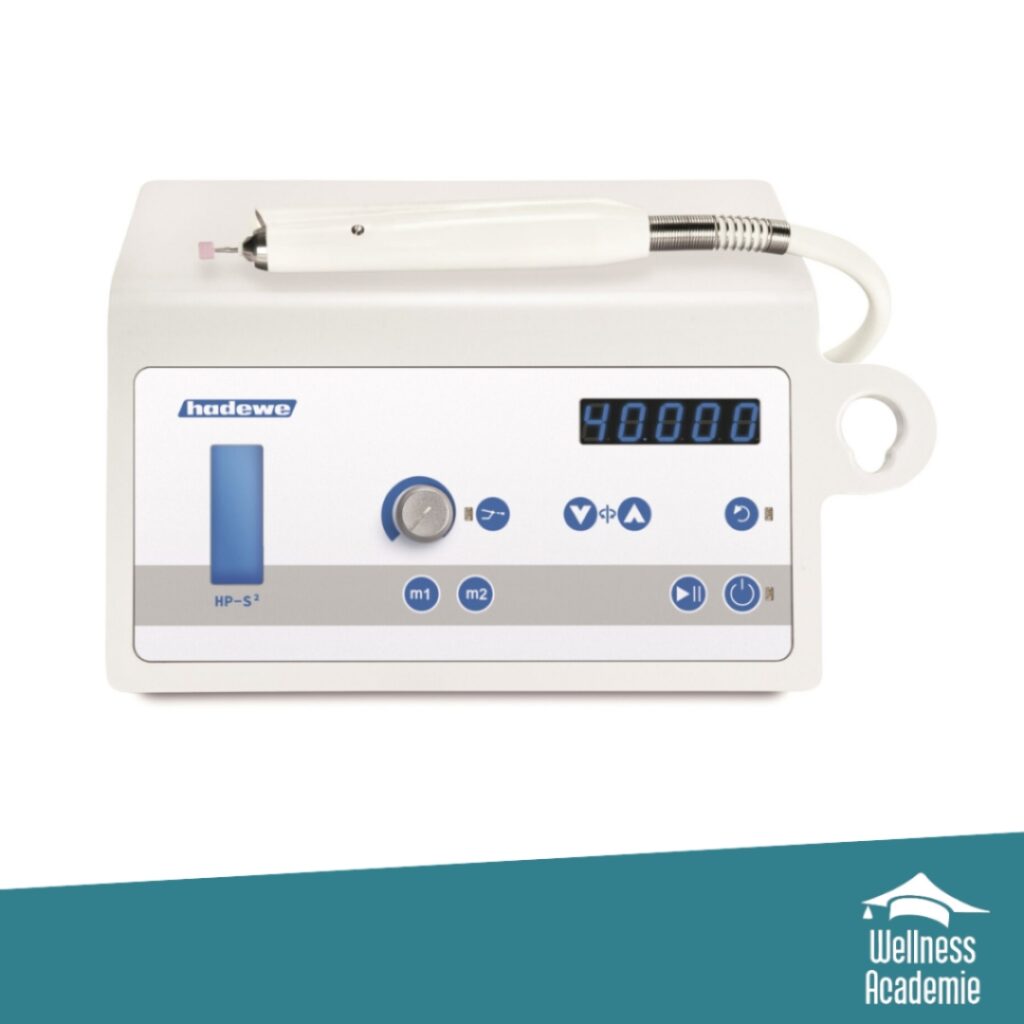 Hadewe HP-S 2; Deze splinternieuwe Hadewe spraymotor is het antwoord op de vraag uit de markt, voor een kwalitatief hoogwaardige machine voor een gunstige prijs. De Hadewe HP-S pedicure motor voldoet aan alle (Code) eisen. Zo wordt deze spraymotor koolborstelloos aangedreven tot een toerental van 40.000 omwentelingen per minuut. De frezen klemmen bij de HP-S automatisch in het handstuk. Het spraysysteem verneveld uiterst fijn en het uitneembare reservoir wordt gevuld met puur demi-water. Hiermee weet u zeker, dat de gezondheid niet wordt geschaad en dat u altijd volgens de Code werkt. De Hadewe HP-S is verder voorzien van een display en tiptoetsen met diverse functies waaronder een pauze- en een reinigingsfunctie.